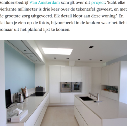 Schildersbedrijf Van Amsterdam schrijft over dit project: ‘Echt elke vierkante millimeter is drie keer over de tekentafel geweest, en met de grootste zorg uitgevoerd. Elk detail klopt aan deze woning.’. En dat kan je zien op de foto’s, bijvoorbeeld in de keuken waar het licht zomaar uit het plafond lijkt te komen.